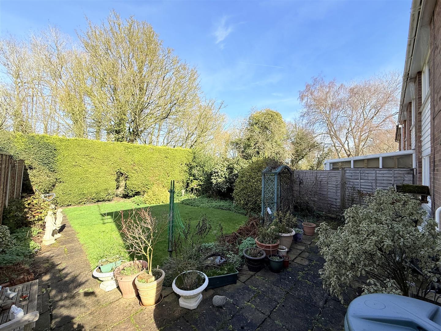 Outside, the rear garden is panel-enclosed and thoughtfully maintained, with a manicured lawn and a private, secluded position. There is off-road parking in front of the enblock garage, adding everyday convenience.